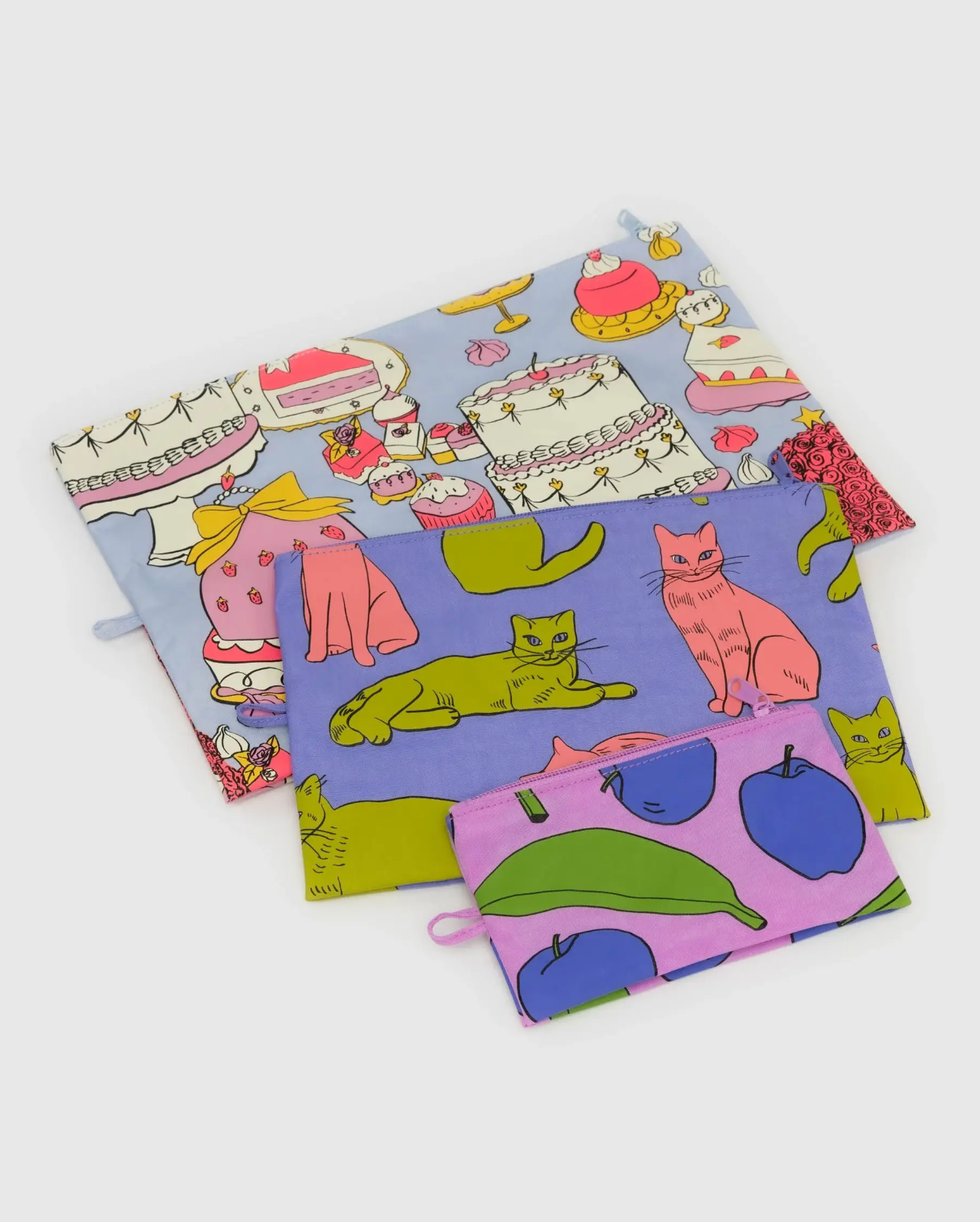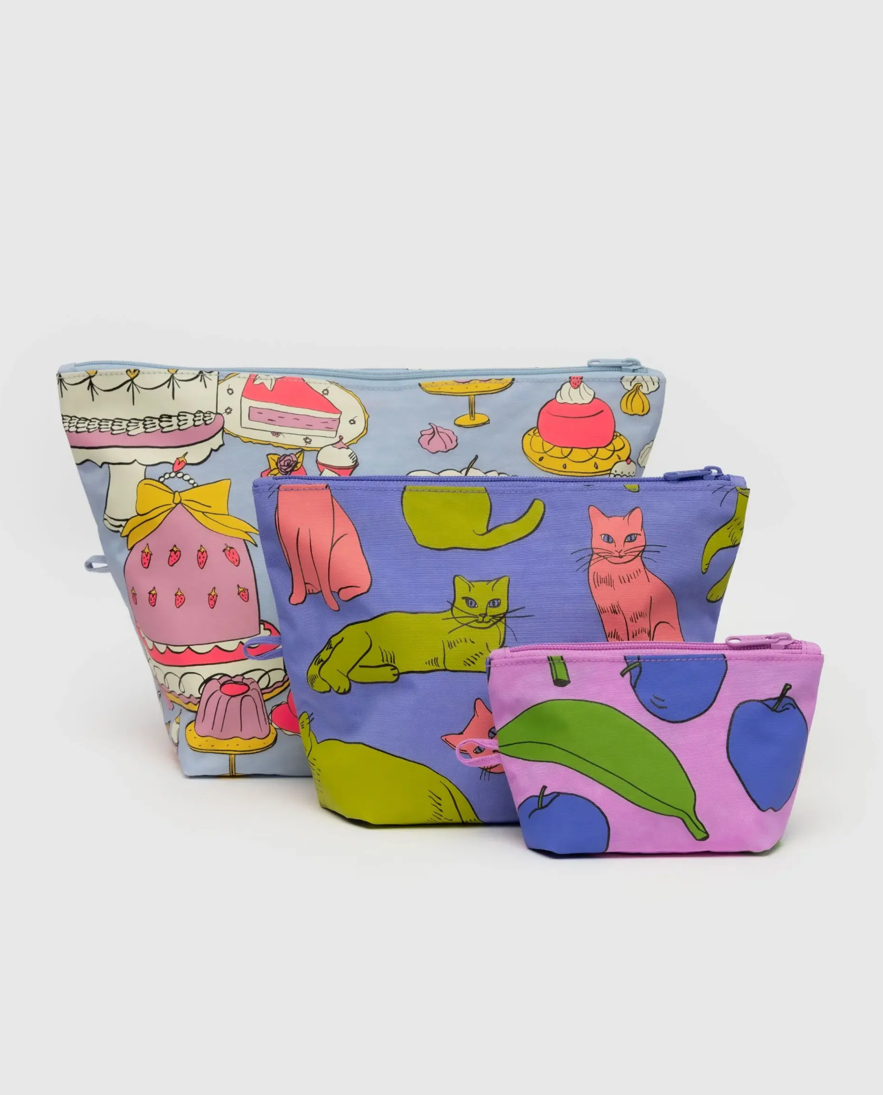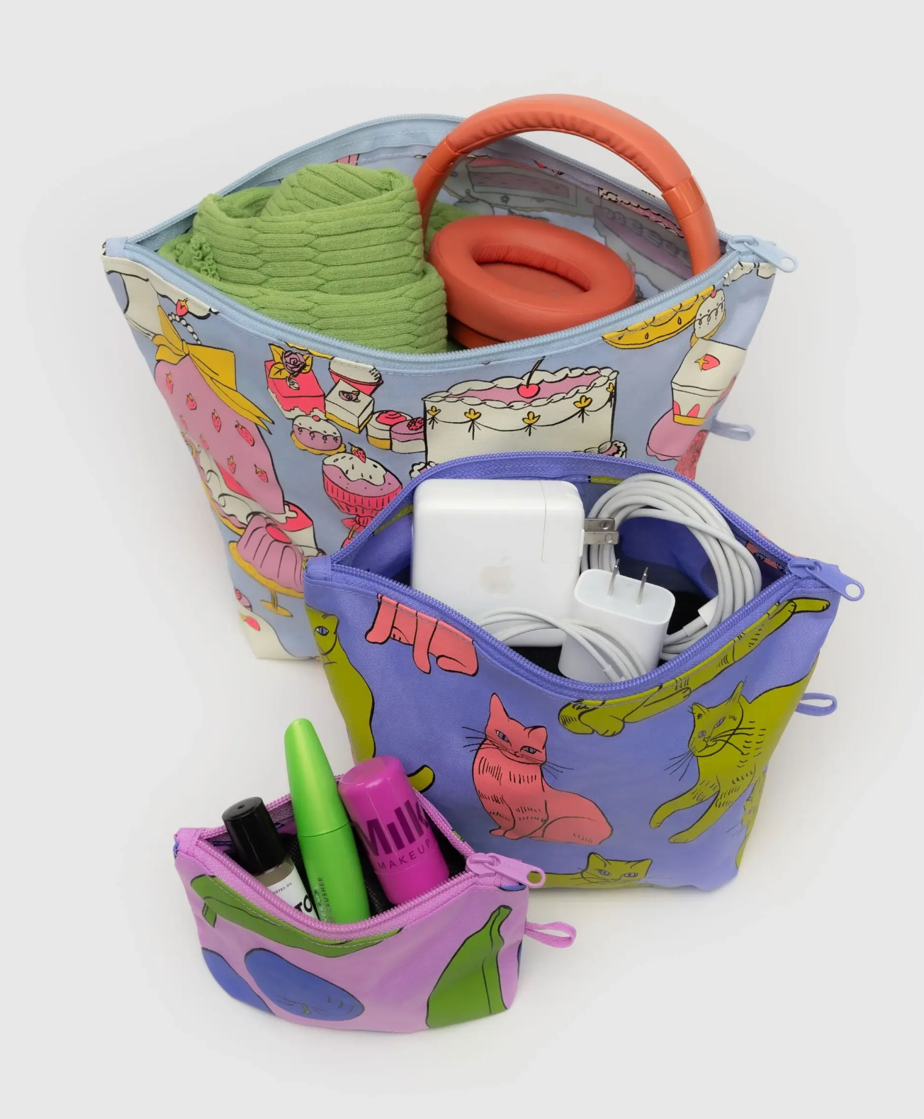 Our Go Pouch Set makes it easy to keep your bag neatly packed and organized. Whatever you're toting—coins, cords, or an extra pair of shoes—this set of three all purpose pouches keeps it together. They expand to hold your essentials and lay flat when not in use.