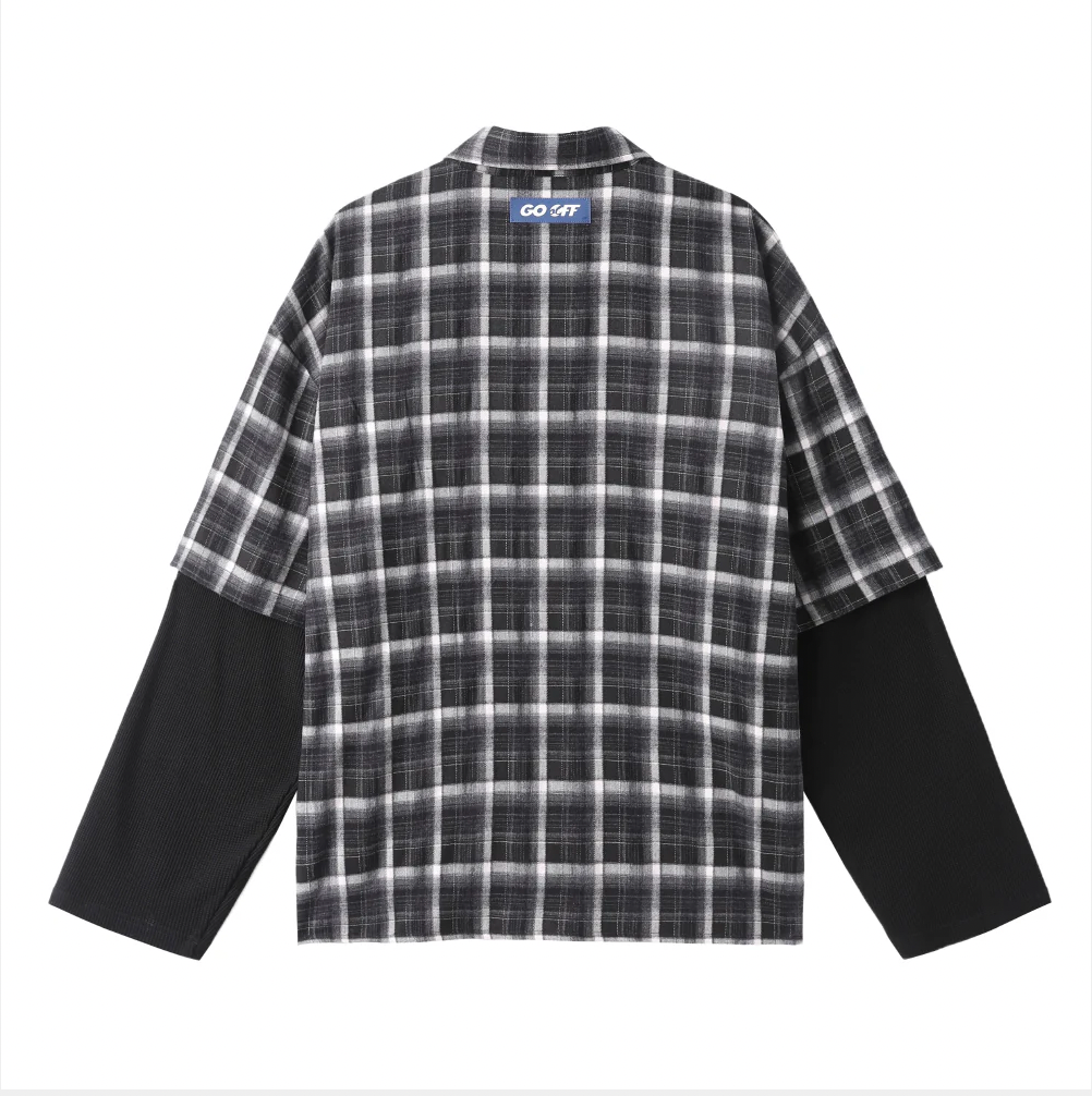 GO OFF | FAUX LAYERED PLAID & WAFFLE KNIT LONG SLEEVE SHIRT 假兩件格紋拼接華夫格長袖襯衫