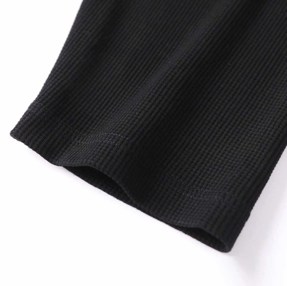 這款襯衫採用假兩件設計,將經典的黑白格紋法蘭絨與純黑華夫格長袖結合,