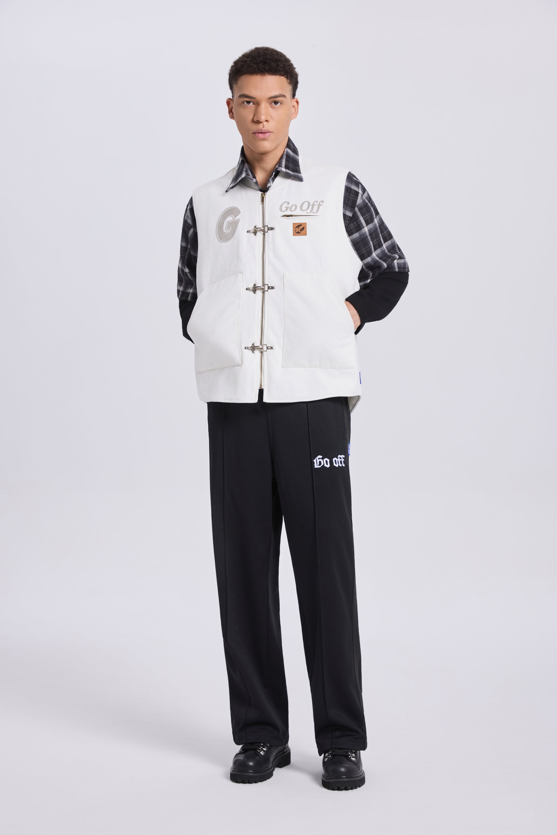 內層採用菱格紋夾棉,提供適度的保暖性與舒適的穿著體驗。胸前設有拉鍊口袋,方便收納小物,並飾有 "Go Off" 質感刺繡與品牌皮標。背面印上大面積的品牌標語印花。寬鬆的版型設計方便與衛衣或長袖 T 恤進行多層次穿搭。